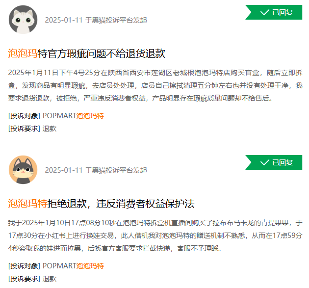 首先是對泡泡瑪特自身而言,除了在部分消費者看來所揮之不去的博彩屬性外,產(chǎn)品質(zhì)量和退貨困難等問題同樣層出不窮,在黑貓投訴平臺上可以看到17000多條有關泡泡瑪特的投訴。