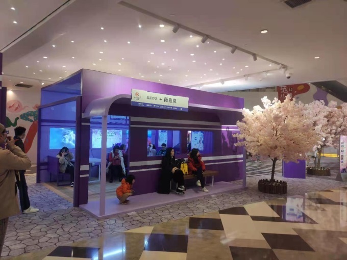 有一年的三月,正是早櫻開(kāi)放時(shí)節(jié)。櫻花的花期較短,就一個(gè)月左右。在上海的某個(gè)商場(chǎng)中庭,布置了一輛“賞櫻列車(chē)”(如下圖):