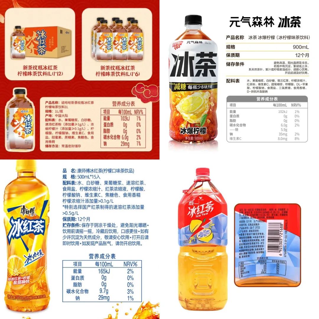 其次,據(jù)品飲匯觀察發(fā)現(xiàn),娃哈哈冰紅茶也做成了“低糖版”,通過(guò)對(duì)比幾大品牌冰紅茶產(chǎn)品可以看到,在含糖量(碳水化合物)這一指標(biāo)中,娃哈哈冰紅茶與元?dú)馍值谋杌鞠喈?dāng),都明顯比康統(tǒng)產(chǎn)品含糖量低了30%左右。