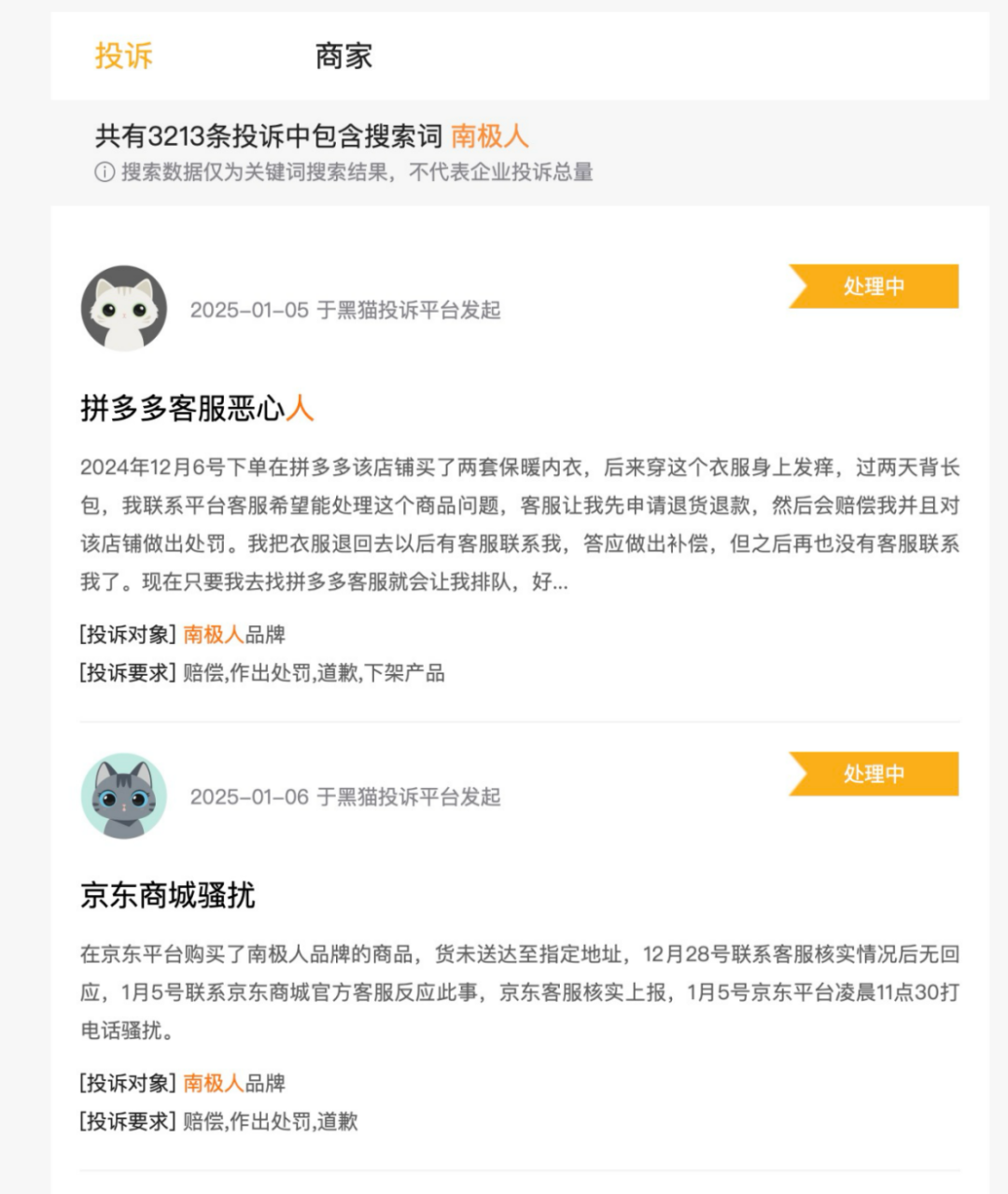 在黑貓投訴平臺(tái)上,關(guān)于南極人的投訴多達(dá)3213條,問題主要涉及虛假宣傳、產(chǎn)品質(zhì)量差、虛假發(fā)貨、退款難等情況。