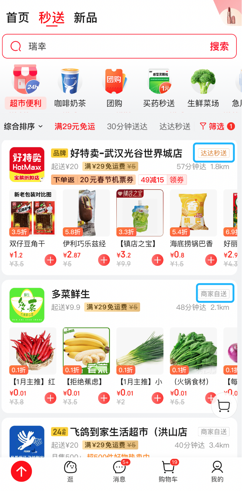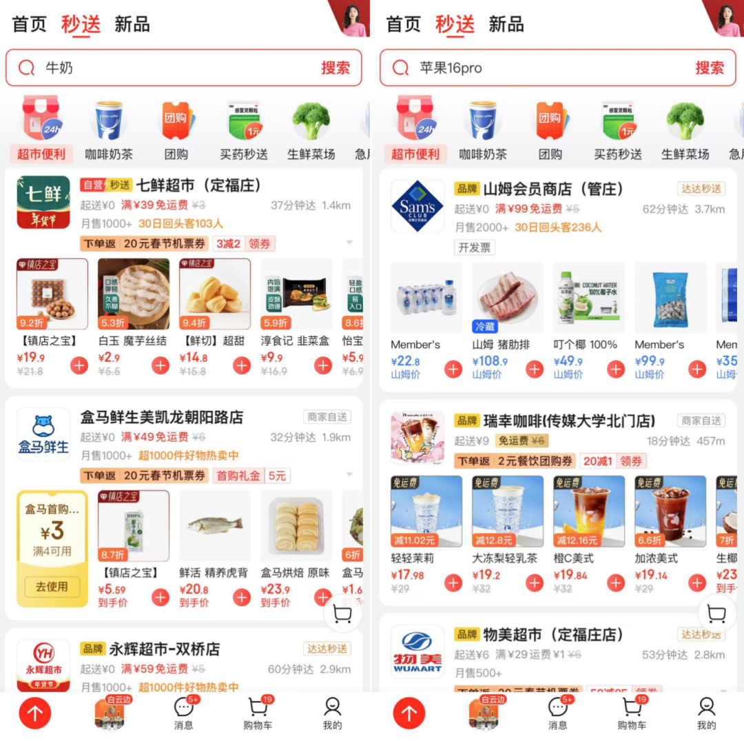 筆者注意到,秒送目前以七鮮超市、沃爾瑪、山姆會(huì)員商店、盒馬鮮生、永輝超市、物美超市、便利蜂、瑞幸咖啡、滬上阿姨、周黑鴨、尊寶比薩、張亮麻辣燙、大米先生等品牌連鎖商家為主,中小商家并不多。