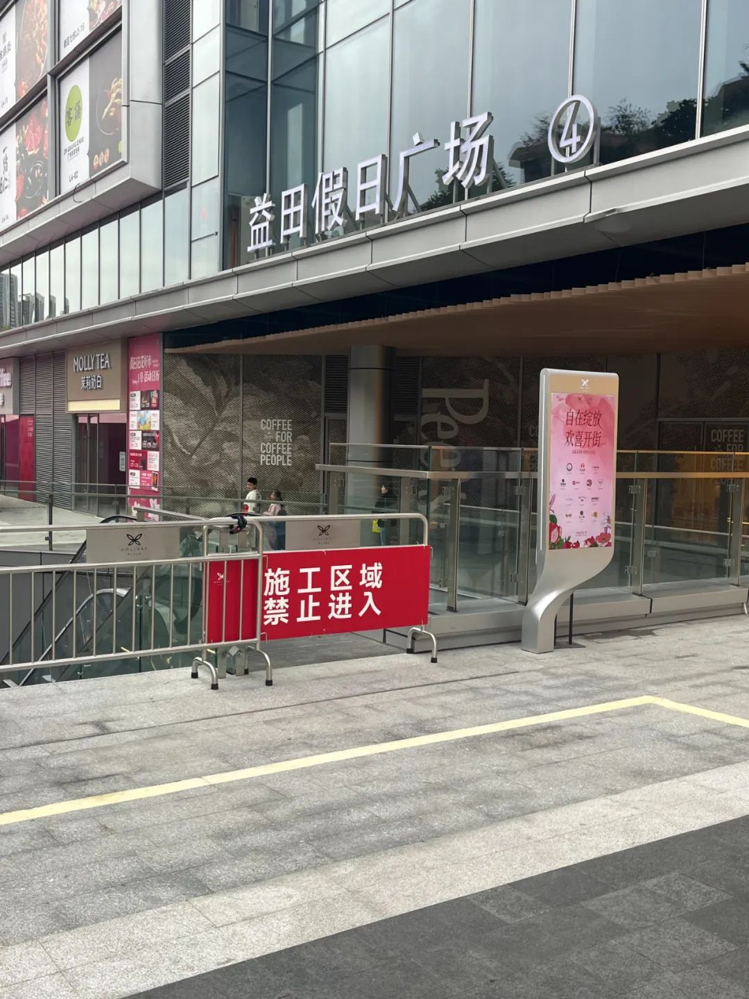 從現(xiàn)場來看,羅湖益田假日廣場的外立面已經(jīng)完全完成了,內(nèi)部的狀態(tài)暫時還看不出來,不過通往商場B1層的下沉廣場還立著“施工區(qū)域,禁止進(jìn)入”的牌子。
