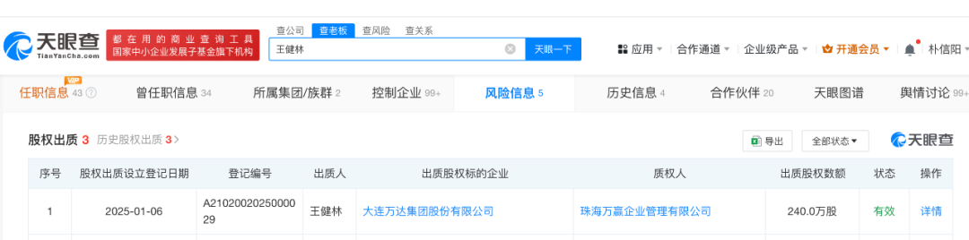 據(jù)天眼查顯示,王健林新增了一條股權(quán)出質(zhì)信息,出質(zhì)股權(quán)標(biāo)的為大連萬(wàn)達(dá)集團(tuán)股份有限公司,質(zhì)權(quán)人為珠海萬(wàn)贏企業(yè)管理有限公司。出質(zhì)股權(quán)數(shù)額為240萬(wàn)股,涵蓋了萬(wàn)達(dá)集團(tuán)的全部股權(quán)。
