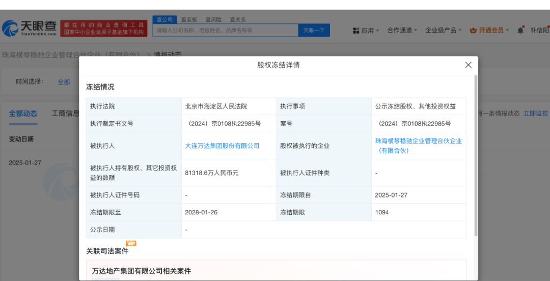 近日,萬(wàn)達(dá)集團(tuán)新增一條股權(quán)凍結(jié)信息,凍結(jié)股權(quán)數(shù)額8.1億余元,凍結(jié)期限自2025年1月27日至2028年1月26日,執(zhí)行法院為北京市海淀區(qū)人民法院。