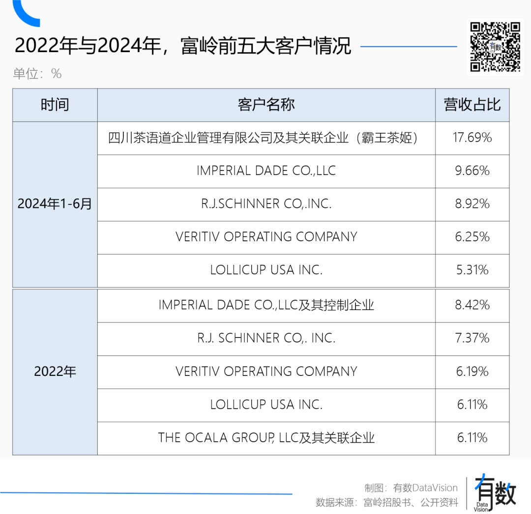 2022年,霸王茶姬甚至不是富嶺的前五大客戶,但到了2024年上半年,霸王茶姬為后者貢獻(xiàn)了17.69%的營收。