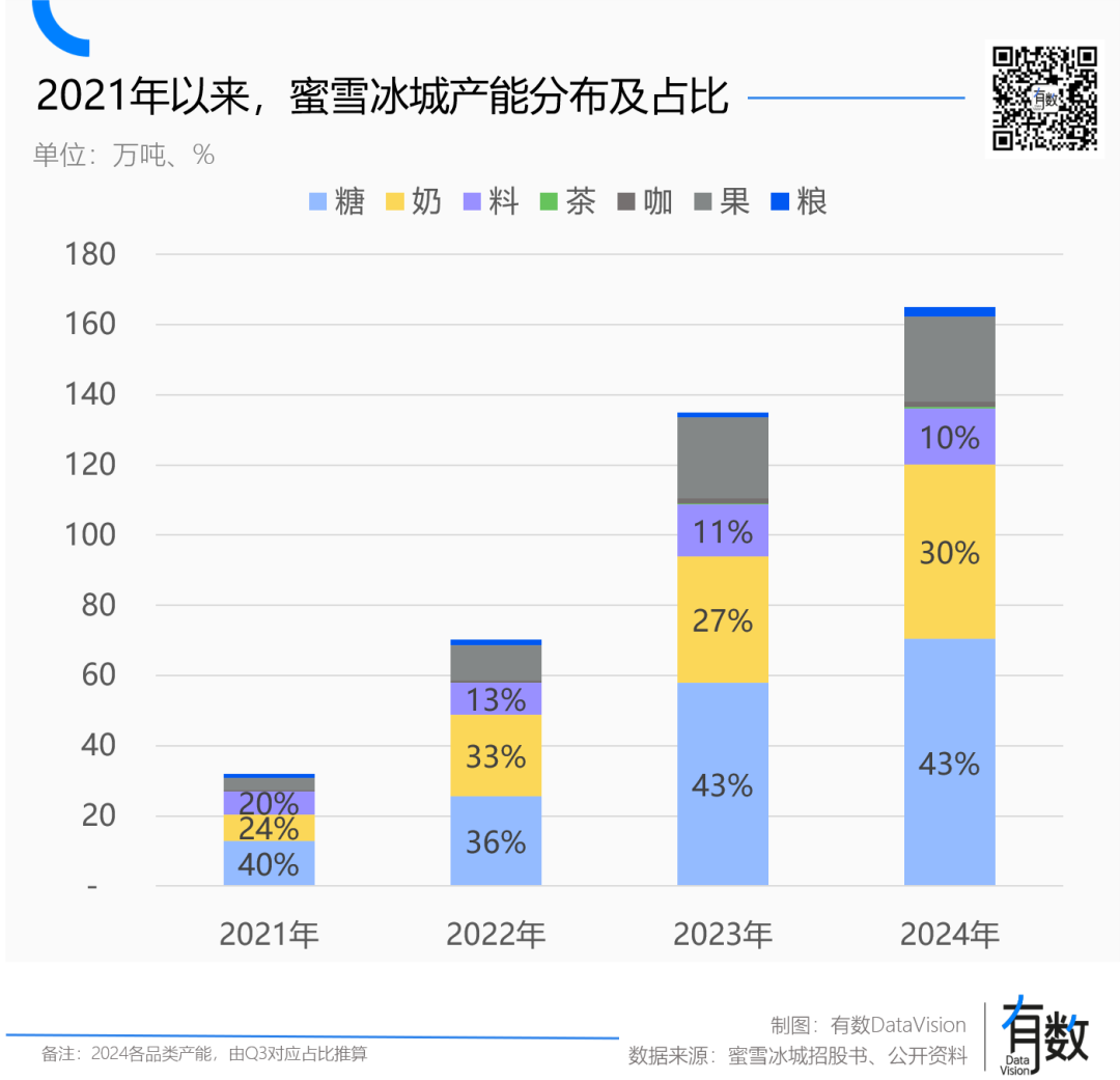 2021年蜜雪冰城門店破萬時,年內(nèi)新增產(chǎn)能就超過17萬噸。目前,蜜雪冰城五大生產(chǎn)基地的年產(chǎn)能總和約165萬噸。