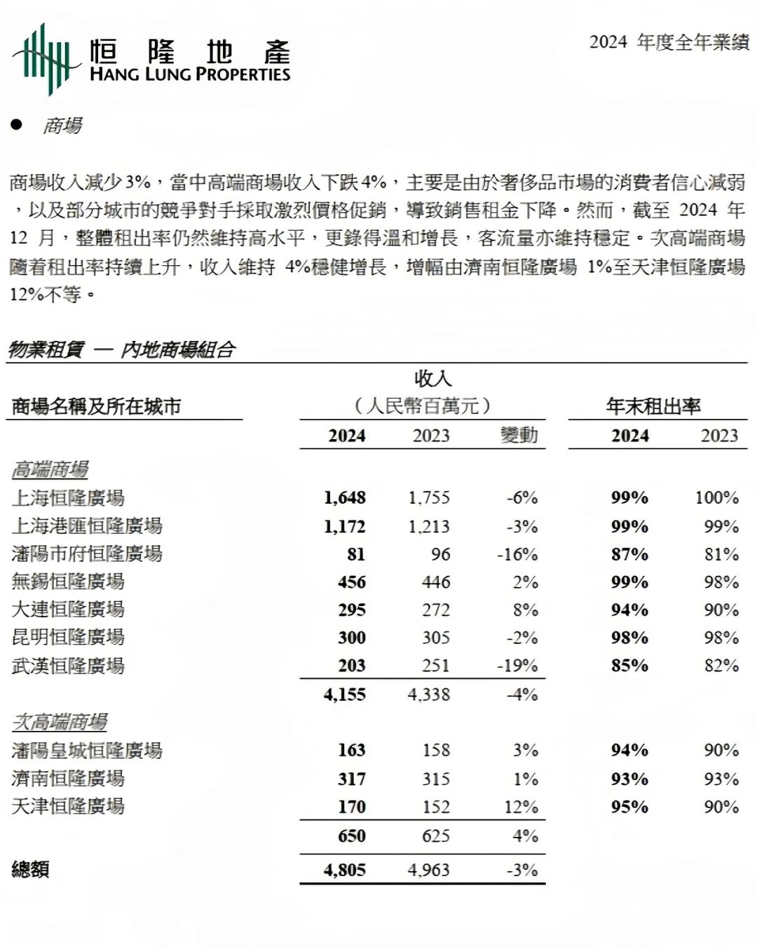2024年內(nèi)地高端消費市場的「慘烈程度」,恒隆地產(chǎn)的全年業(yè)績可見一斑。