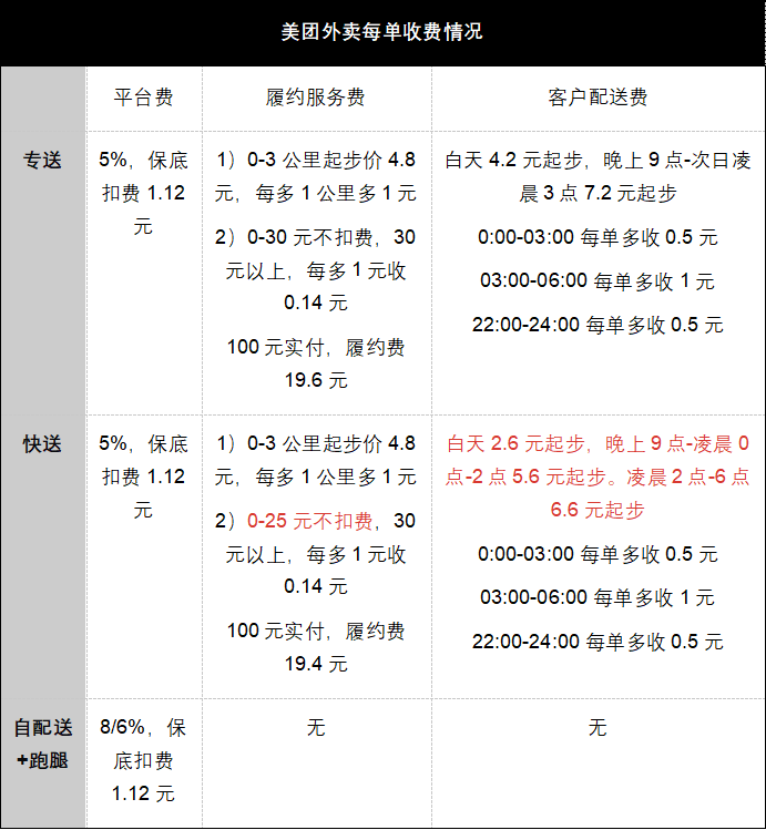 實(shí)際上,平臺(tái)只是免去了本就不高的“平臺(tái)費(fèi)”,而履約服務(wù)費(fèi)和配送費(fèi)才是每單外賣最主要的開銷。例如,美團(tuán)將所有費(fèi)用分化為平臺(tái)費(fèi)(傭金)、履約服務(wù)費(fèi)(自配沒有)、客戶配送費(fèi)三類。