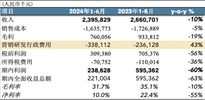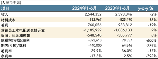 首先是經(jīng)營(yíng)業(yè)績(jī)的top line和bottom line,24年上半年收入下降2%,而材料成本、營(yíng)銷人力、設(shè)備折舊租金等等一系列的成本項(xiàng)則同比增長(zhǎng)10%左右,利潤(rùn)被嚴(yán)重壓縮。