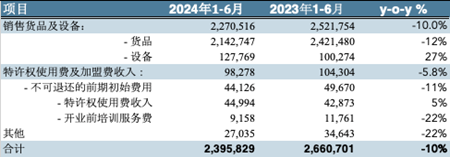 24年上半年,為了增加開店數(shù)量和應(yīng)對(duì)外部競(jìng)爭(zhēng),茶百道加大了對(duì)加盟商的政策支持以及向加盟商出售貨品及設(shè)備的優(yōu)惠力度,這使得盡管新開店數(shù)量和新增加盟商數(shù)量還在增長(zhǎng),但加盟費(fèi)和特權(quán)使用費(fèi)卻同比下降。