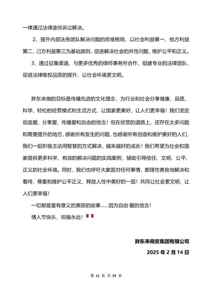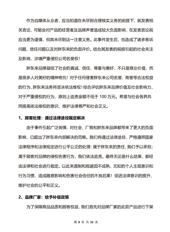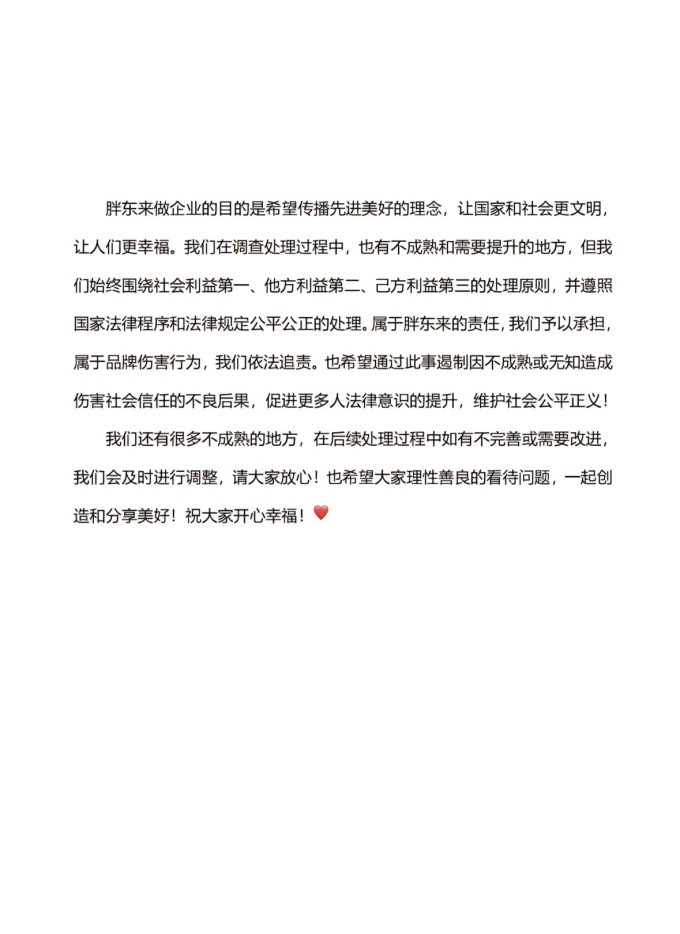 由于事件引起廣泛輿情,對社會、廠商和胖東來品牌都帶來了更大的負(fù)面影響,已超出了胖東來內(nèi)部解決的范疇。我們將通過法律途徑,嚴(yán)格遵照國家法律程序和法律規(guī)定進(jìn)行公平公正的處理:屬于胖東來的責(zé)任,我們予以承擔(dān);屬于顧客對品牌的侵權(quán)傷害行為,我們依法追責(zé)。最終無論是什么結(jié)果,都經(jīng)由法律和社會進(jìn)行裁定。以此來遏制和規(guī)避因不成熟、無知的個人主觀意識和行為習(xí)慣,造成隨意影響和傷害社會信任的不良后果!促進(jìn)法律意識的提升維護(hù)社會的公平和正義。