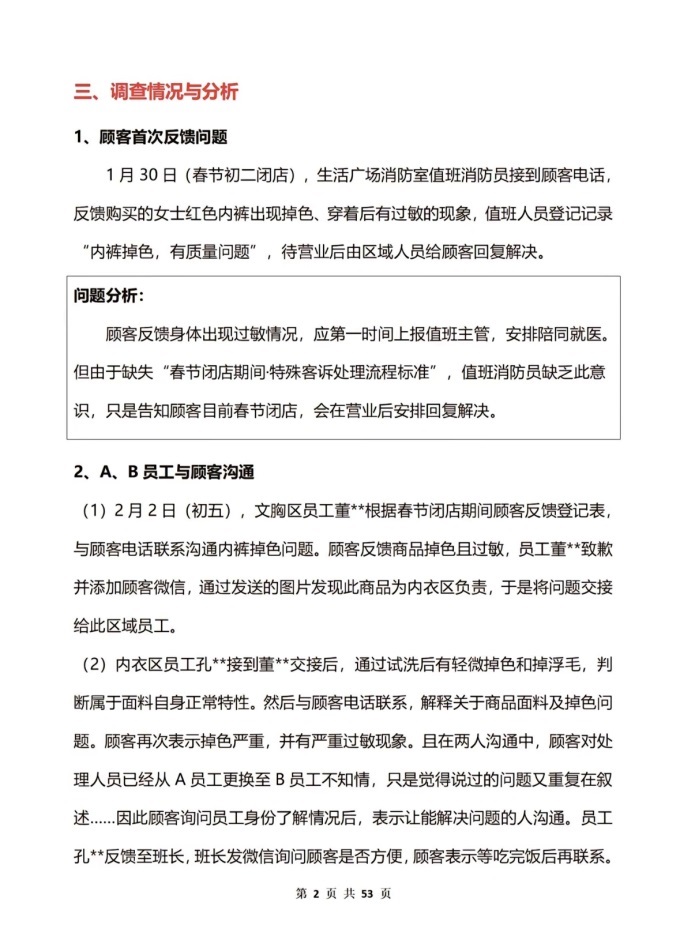 附:《關(guān)于“紅色內(nèi)褲掉色、過敏以及部門處理過程”的調(diào)查報告》(備注:調(diào)查報告+“民主合議庭、商品檢測報告”附件共53頁,以下為調(diào)查報告部分)