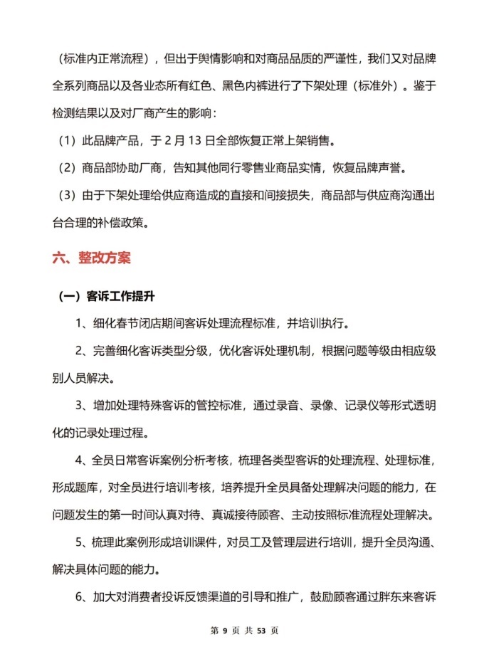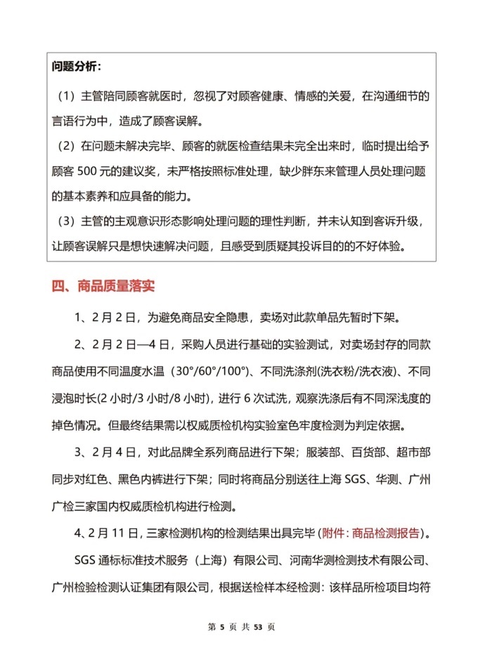 該報告共53頁,詳細(xì)說明了事件起因、事件調(diào)查人員及調(diào)查渠道、調(diào)查情況與分析、商品質(zhì)量落實、處理方案和整改方案,同時附上了民主合議庭和商品檢測報告。