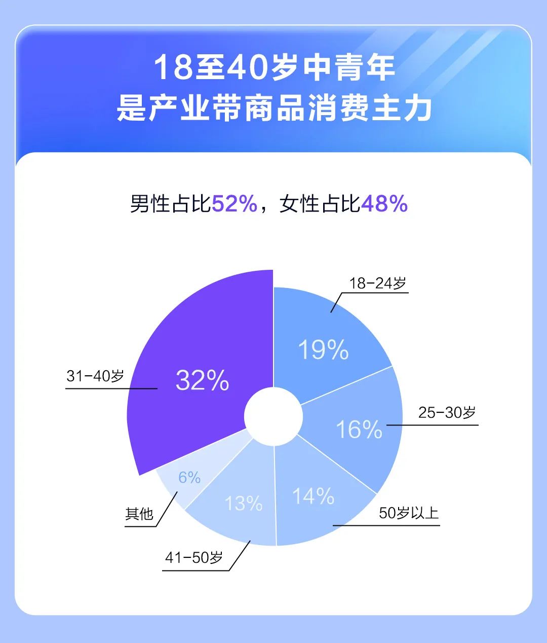 從報告數(shù)據(jù)可以看出,在直播間購買產(chǎn)業(yè)帶商品的消費(fèi)者中,男性占比52%,女性占比48%。其中,18歲至40歲的中青年是消費(fèi)主力,占比67%。