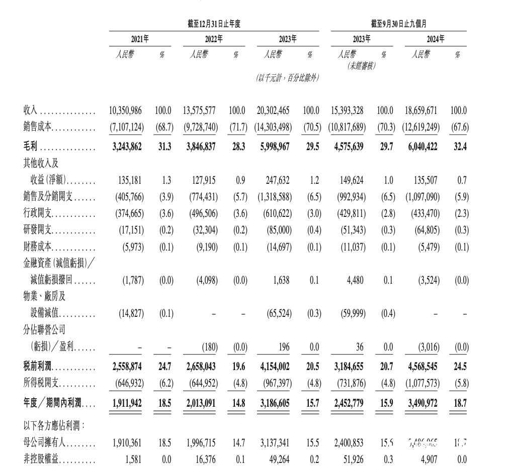 招股書顯示,蜜雪冰城在2022年、2023年、2024年前九個月,分別實現(xiàn)了136億元、203億元、187億元的收入,分別同比增長31.2%、49.6%及21.2%。