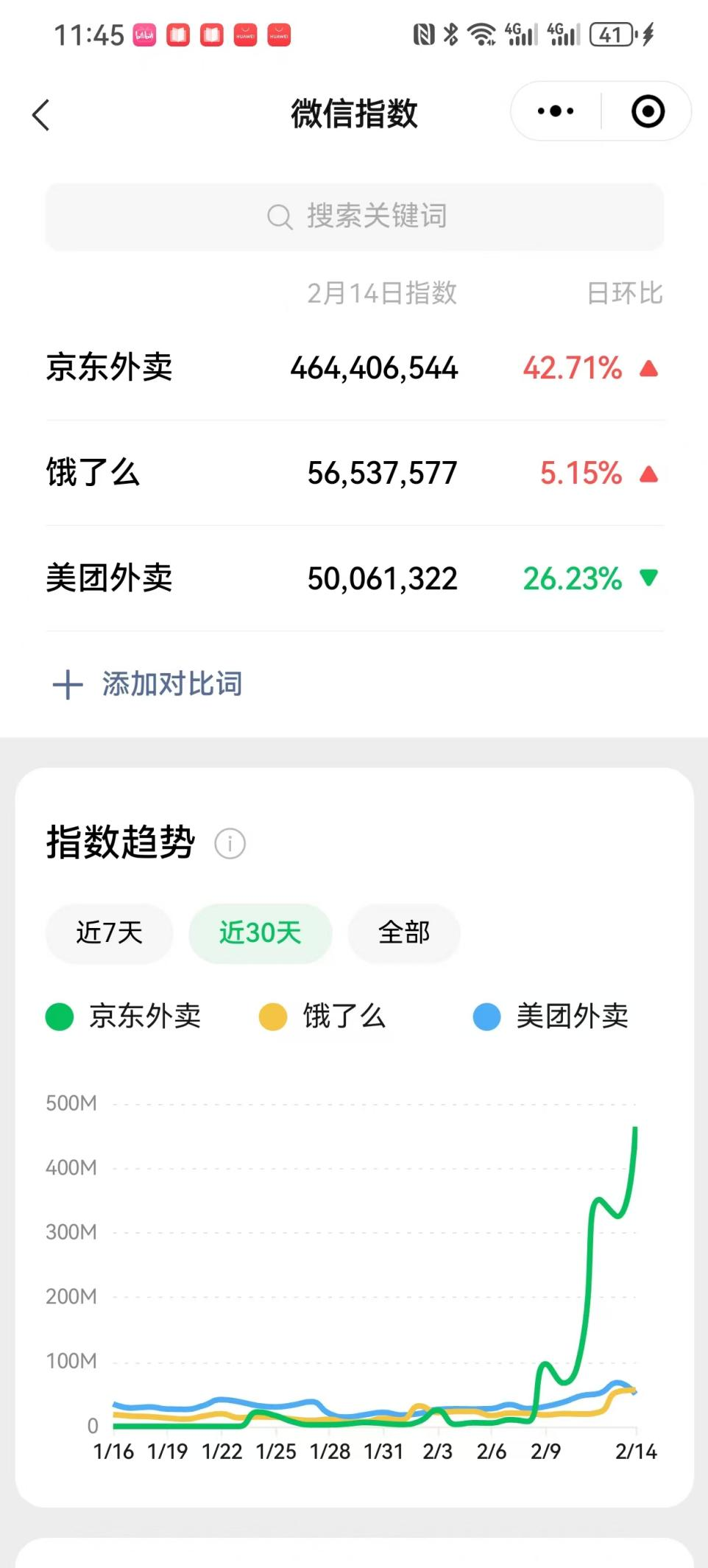 自京東外賣官宣以來,其微信指數(shù)急速飆升。2月14日,“京東外賣”微信指數(shù)達4.64億,是“餓了么”微信指數(shù)的8.21倍、“美團外賣”微信指數(shù)的9.28倍。