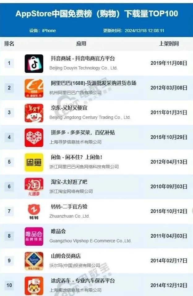 同年12月,網(wǎng)經(jīng)社電子商務(wù)研究中心發(fā)布了《2024年12月AppStore中國免費(fèi)榜(購物)TOP100》。經(jīng)過9個(gè)月的發(fā)展,抖音商城廣受歡迎,排名第一,阿里巴巴(1688)、京東、拼多多、閑魚、淘寶等平臺緊隨其后。