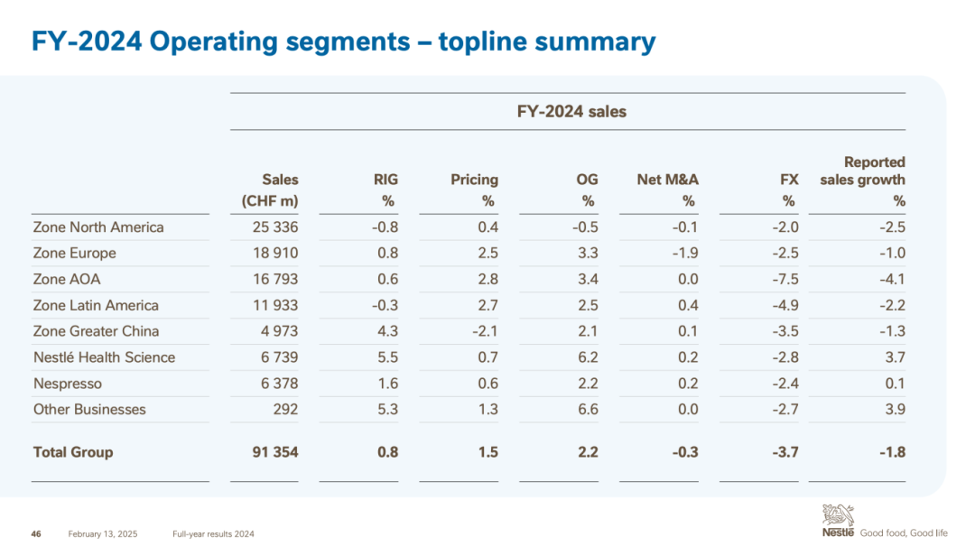 數(shù)據(jù)顯示,雀巢全年銷售額為913.54億瑞士法郎(約合人民幣7391億元),同比微降1.8%;凈利潤為108.84億瑞士法郎(約合人民幣880億元),同比下降2.9%。盡管整體銷售額略有下滑,但若剔除匯率影響,其有機(jī)增長率達(dá)到2.2%,實際內(nèi)部增長率為0.8%,顯示出核心業(yè)務(wù)的穩(wěn)定性。