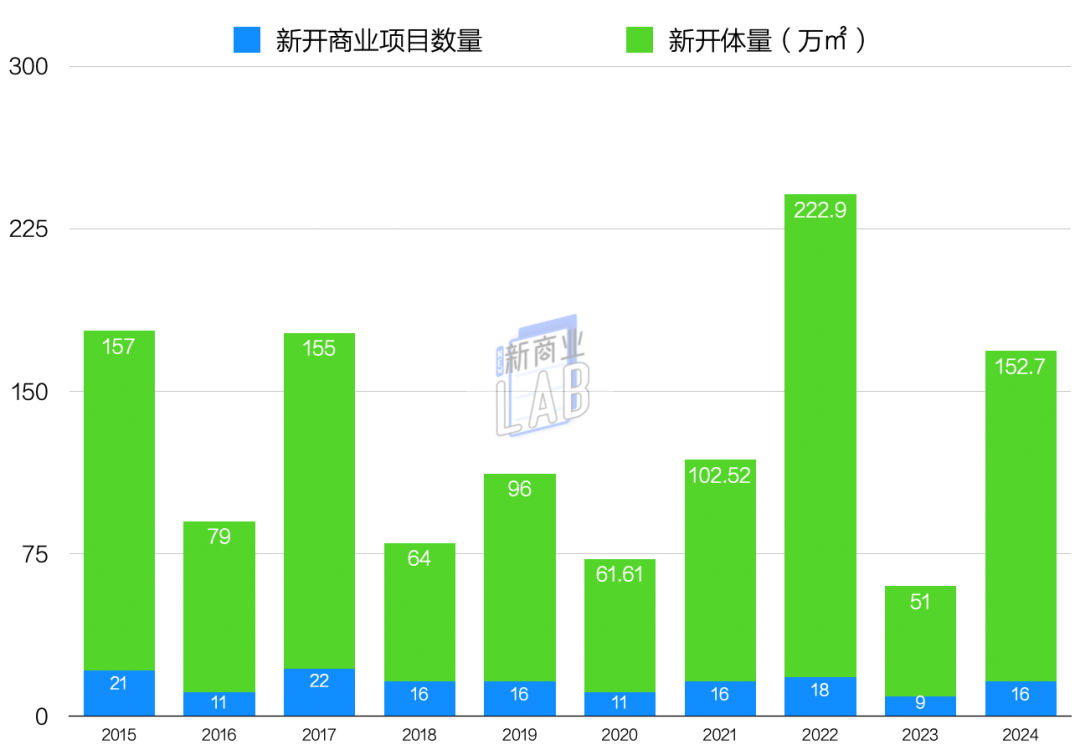 項(xiàng)目體量,去年新開項(xiàng)目總體量達(dá)152.7萬(wàn)㎡,遠(yuǎn)超2023年的51萬(wàn)㎡,次于2022年的222.9萬(wàn)㎡,也是2015年之后的「歷史第三高體量」。