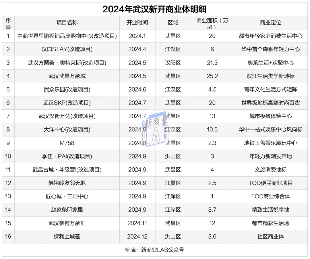 據(jù)「新商業(yè)LAB」不完全統(tǒng)計(jì),武漢在2024年共迎來16個(gè)新開(含改造)商業(yè)項(xiàng)目。