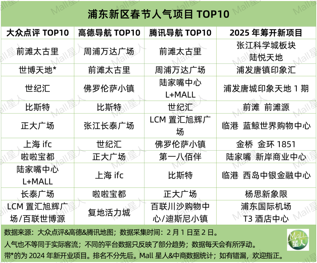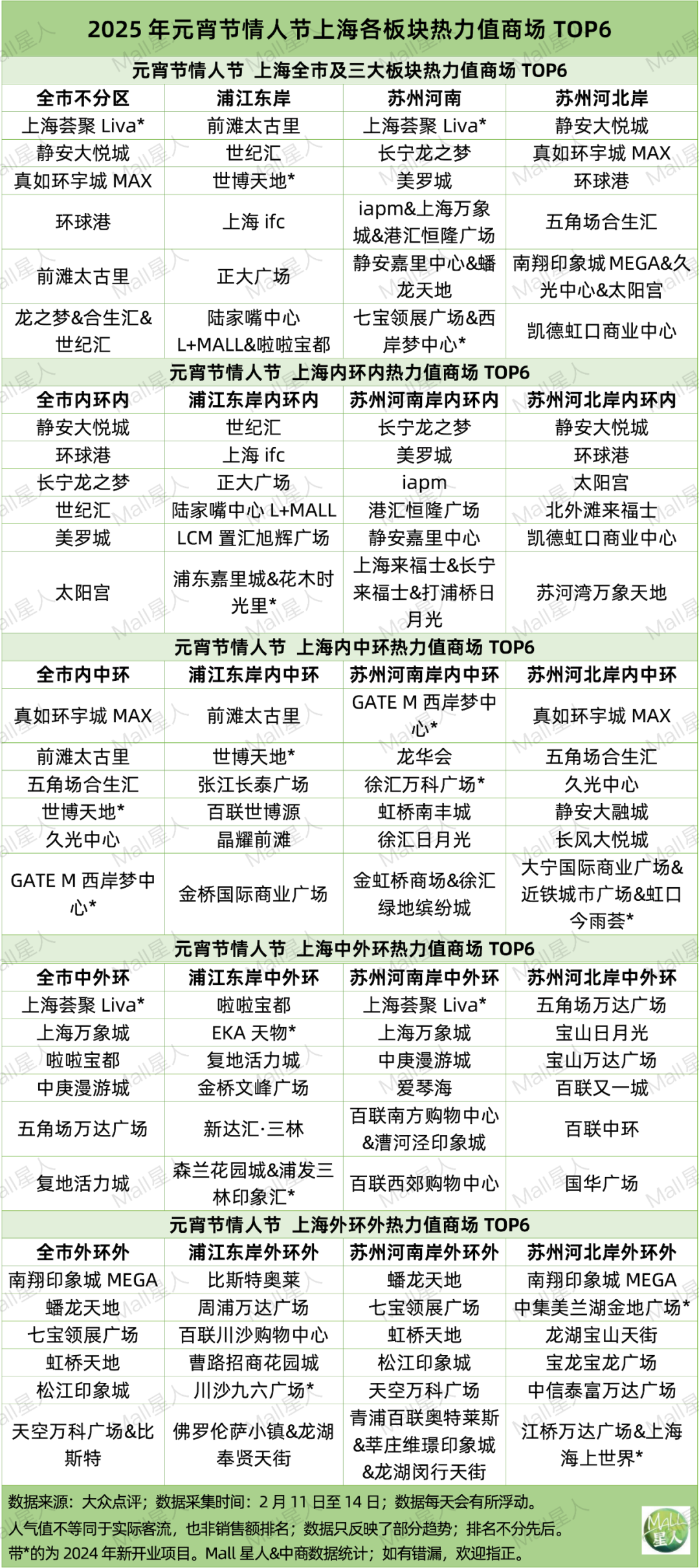 再看看元宵節(jié)情人節(jié)期間各區(qū)人氣商場(chǎng)TOP10的名單匯總,可以跟第二大部分內(nèi)容——各區(qū)春節(jié)期間的頭部名單對(duì)照閱讀。