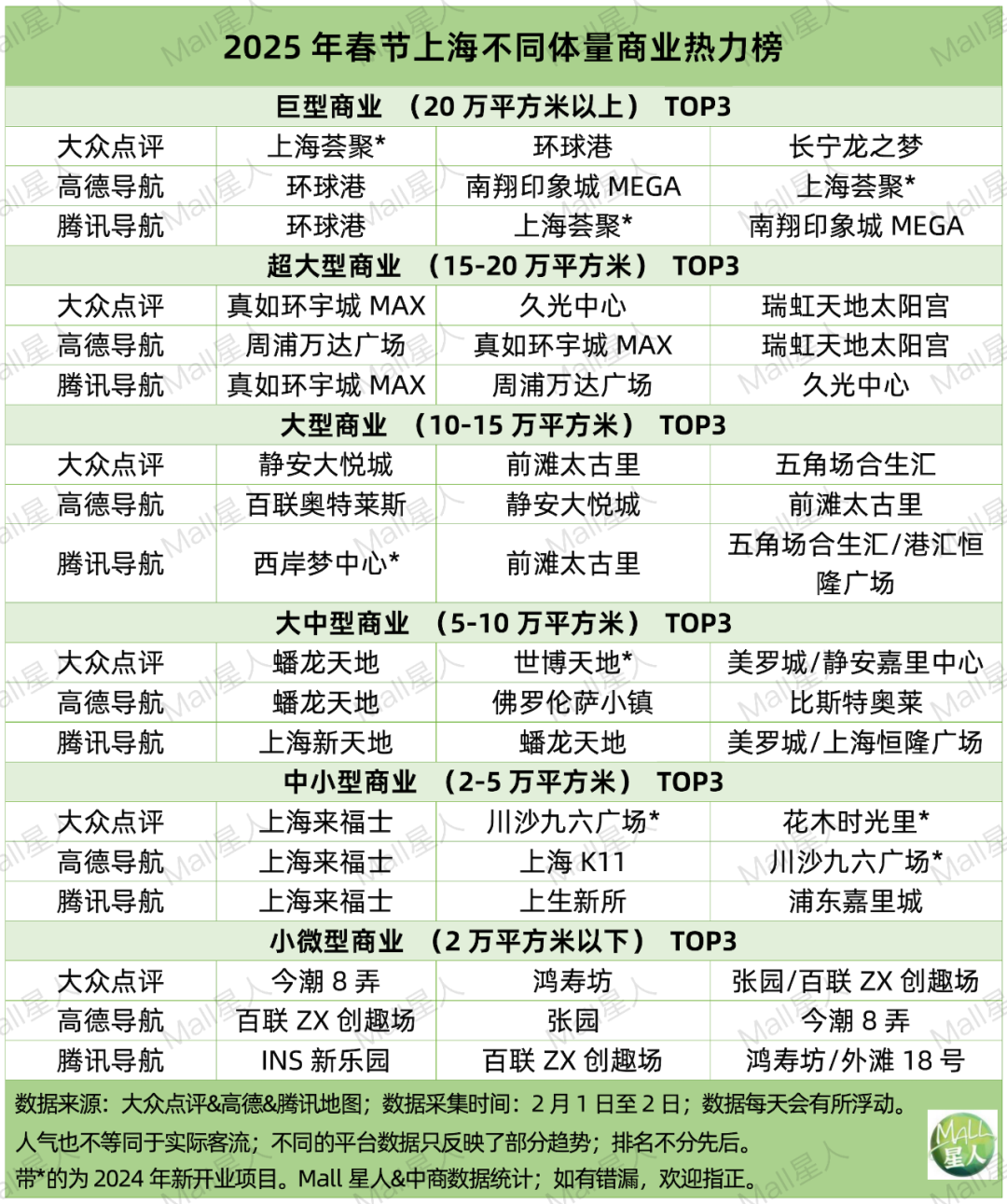 通過2025年春節(jié)期間的數(shù)據(jù),我們從多個(gè)角度盤點(diǎn)了上海目前在營(yíng)的500多家大中型商場(chǎng)(3萬平方米以上)外加數(shù)量更多的小微型商業(yè),總計(jì)上千個(gè)大大小小的各類商業(yè)載體,看哪些商場(chǎng)在春節(jié)檔期中脫穎而出,成功登上“熱力榜”。上榜的商場(chǎng)也順勢(shì)帶熱相關(guān)商圈——如長(zhǎng)寧臨空、普陀真如、徐匯西岸、靜安大寧。