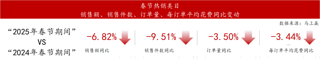基于“2025春節(jié)期間”與“2024春節(jié)期間”兩個時間段的同比情況進行比較,可以看到,銷售額、銷售件數(shù)、訂單數(shù)量、訂單平均花費,依然均呈現(xiàn)小幅度的同比下降,同比降幅均在10%以內。通常來說,除銷額、銷量指標外,訂單數(shù)量的變化可以反映消費者購物消費頻次的變化,訂單平均花費的變化則可以反映消費者(在這一類目集合內)的消費預算變化。