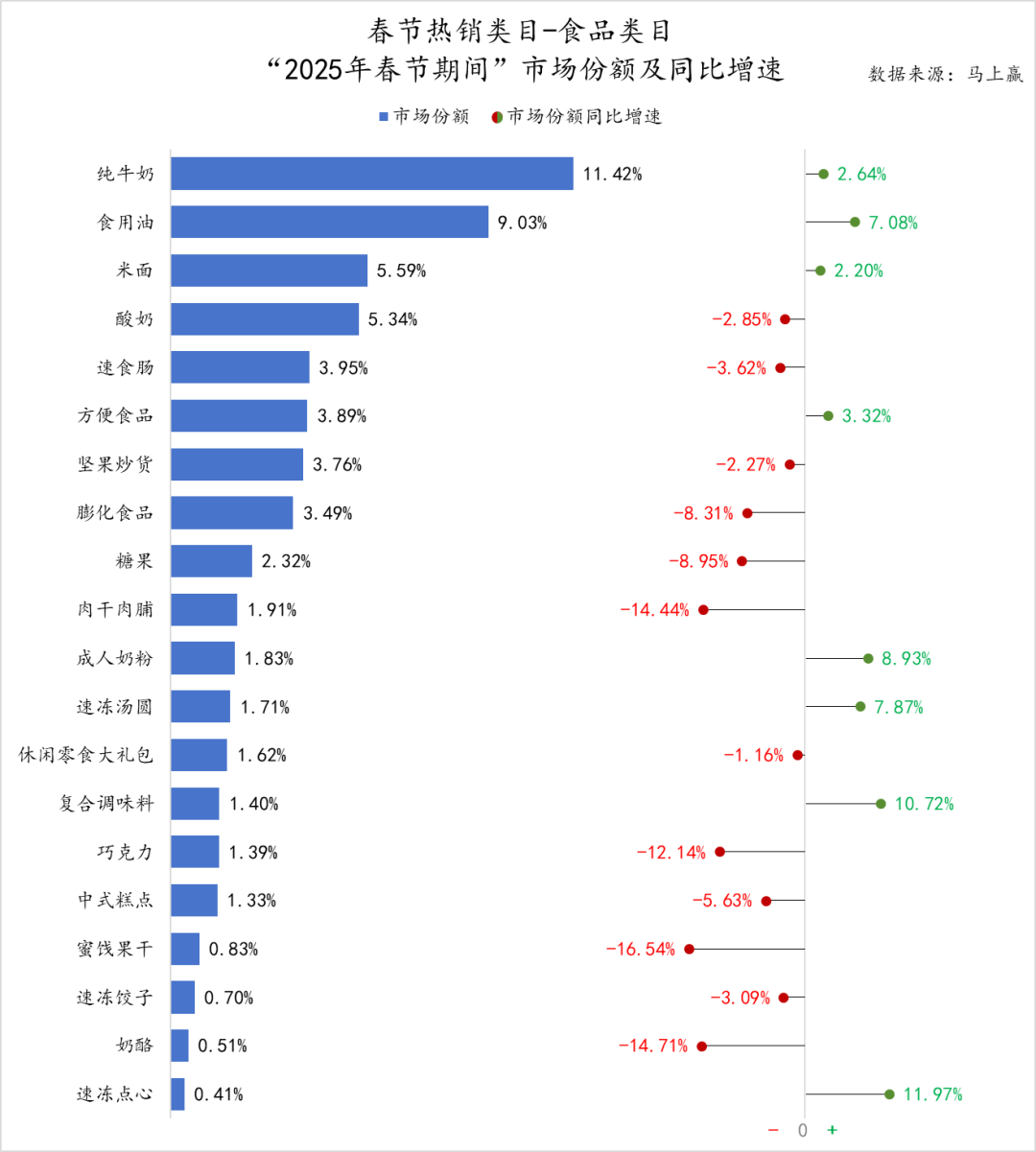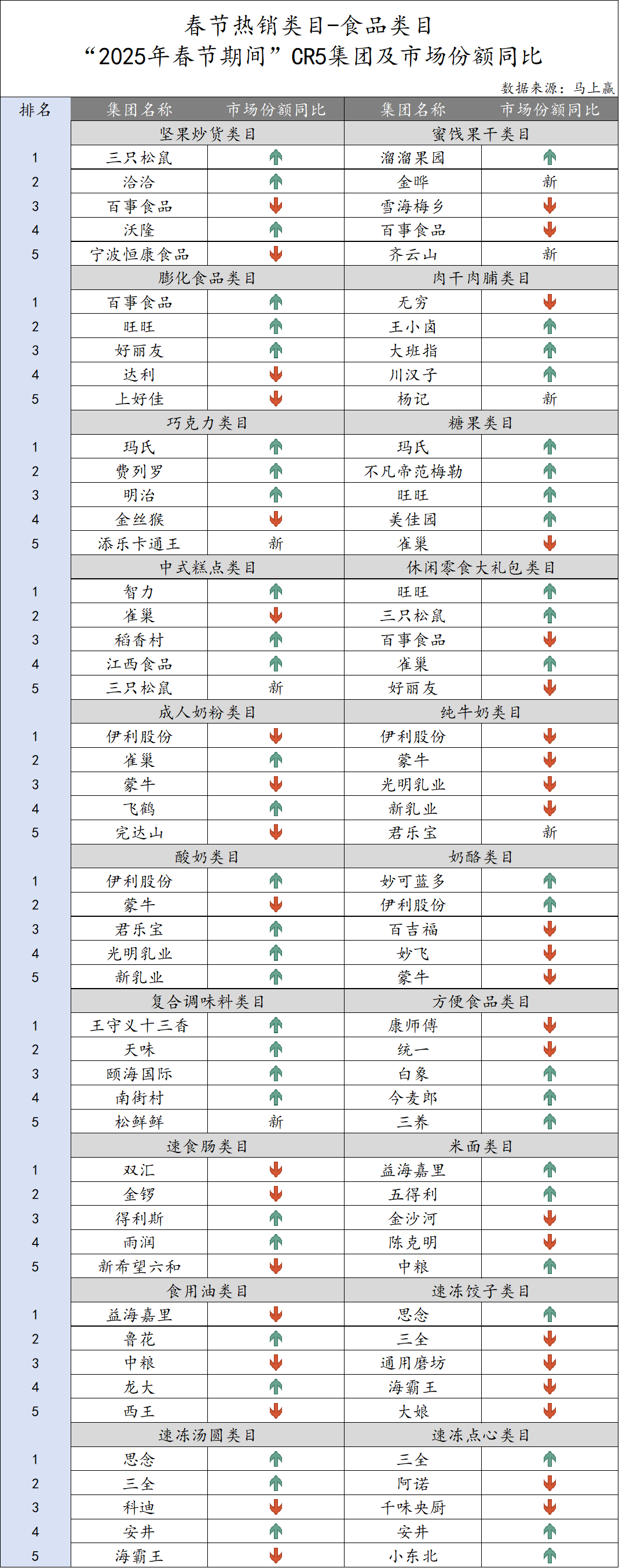 觀察“2025春節(jié)期間”食品類目的CR5集團及其市場份額同比變化: