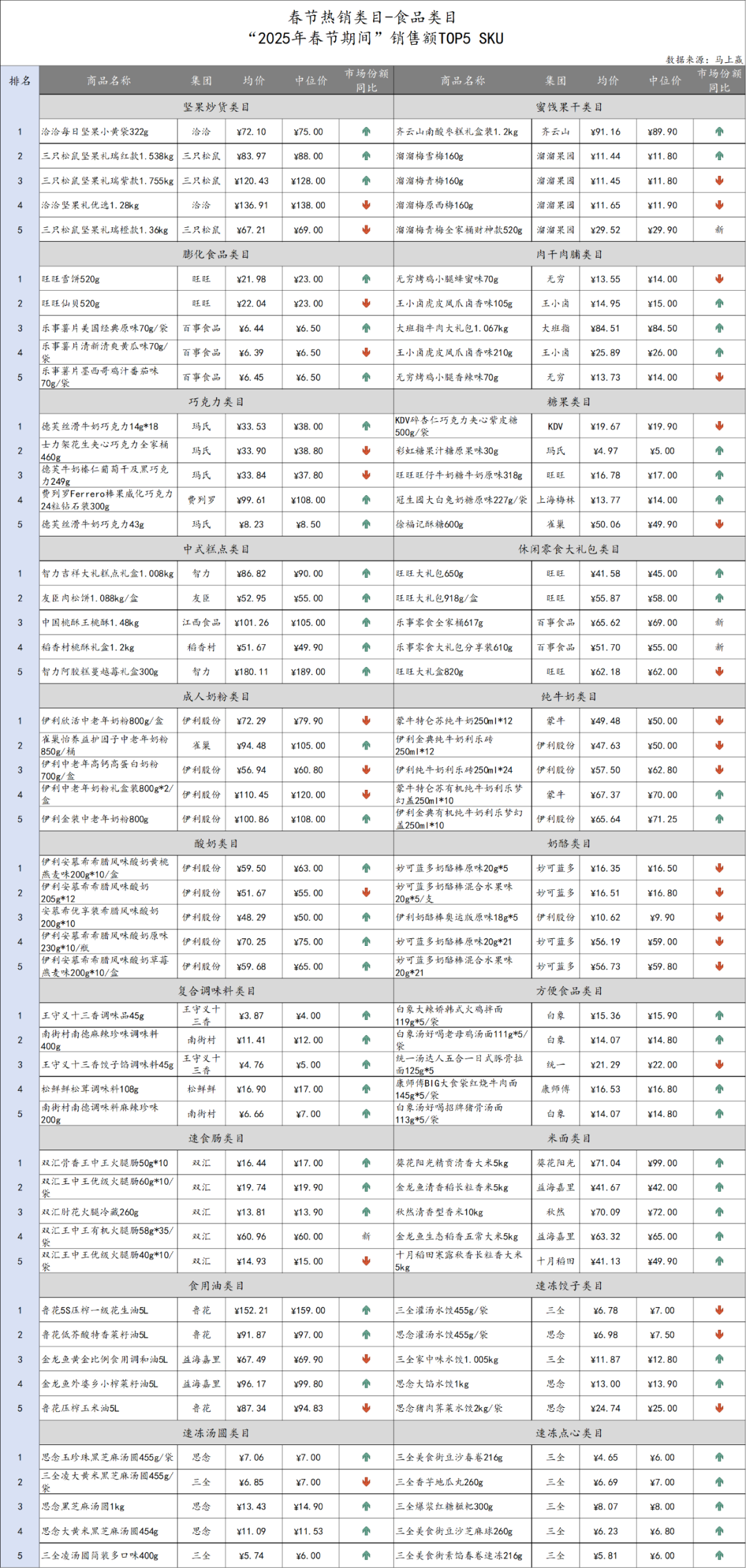 ·第二部分:對上述四個場景內的31個類目,進行分類目各自在春節(jié)期間的表現(xiàn)進行觀察,維度包括類目銷額/銷售件數(shù)/訂單量/每訂單平均花費,各類目價格指數(shù)同比,各類目市場份額同比(食品/飲料和酒大類內),類目CR5集團各自市場份額及CR5集團合計市場份額同比變化,以及各類目在“2025春節(jié)期間”的銷售額Top SKU。