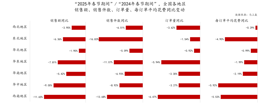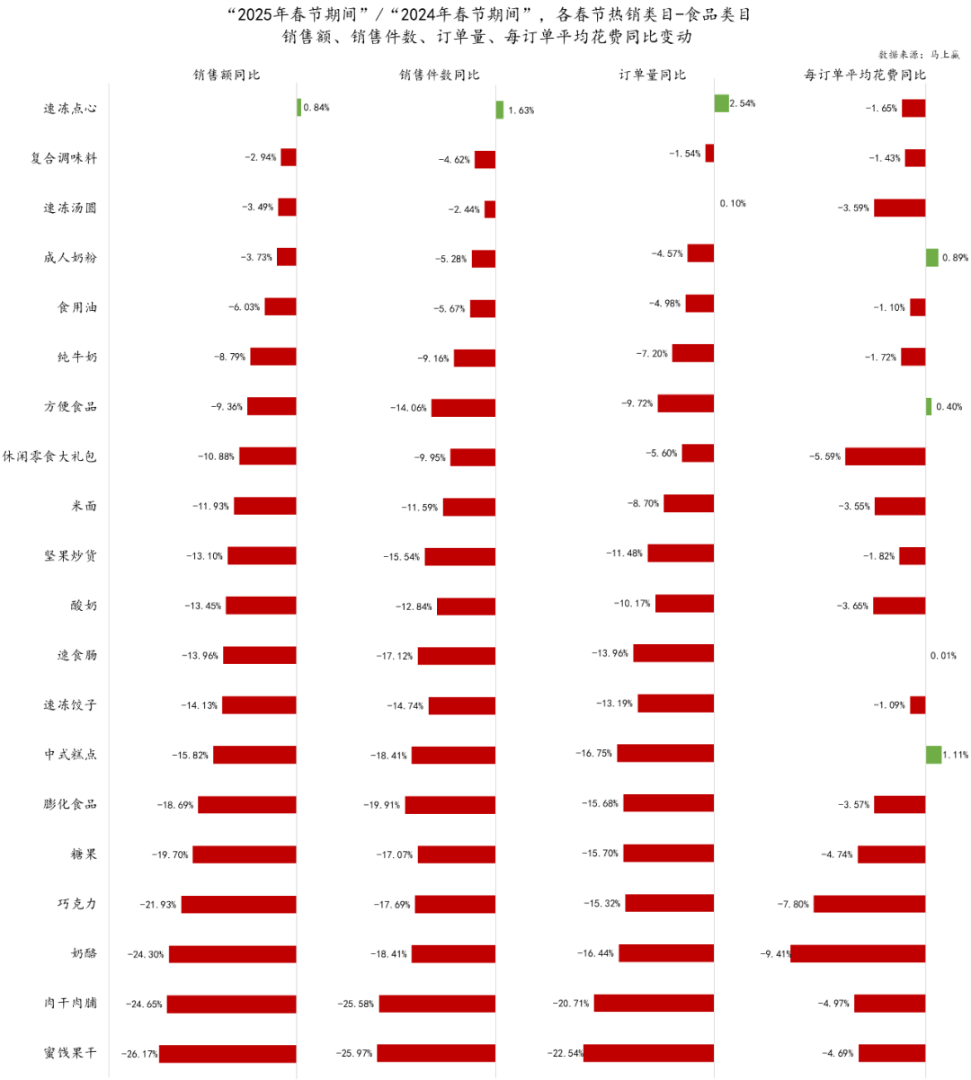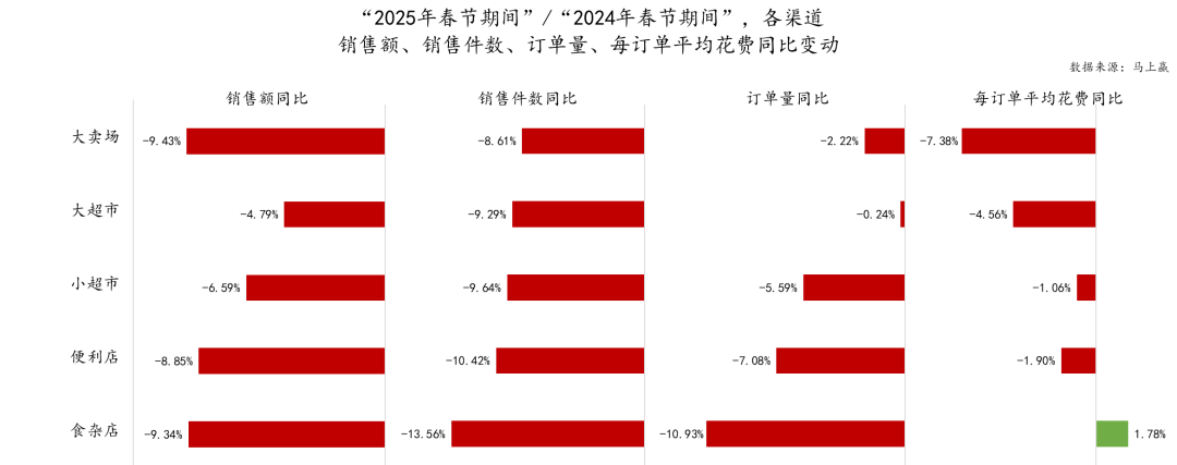 同時,為了確保在兩年春節(jié)消費數(shù)據(jù)對比時樣本池的一致性,本次2025年、2024年的類目訂單數(shù)據(jù)對比中所使用的訂單來源樣本門店均為連續(xù)門店,即該門店自2025年春節(jié)前推14個月均在馬上贏線下零售監(jiān)測網絡當中活躍,2025年與2024年門店樣本池規(guī)模相同。