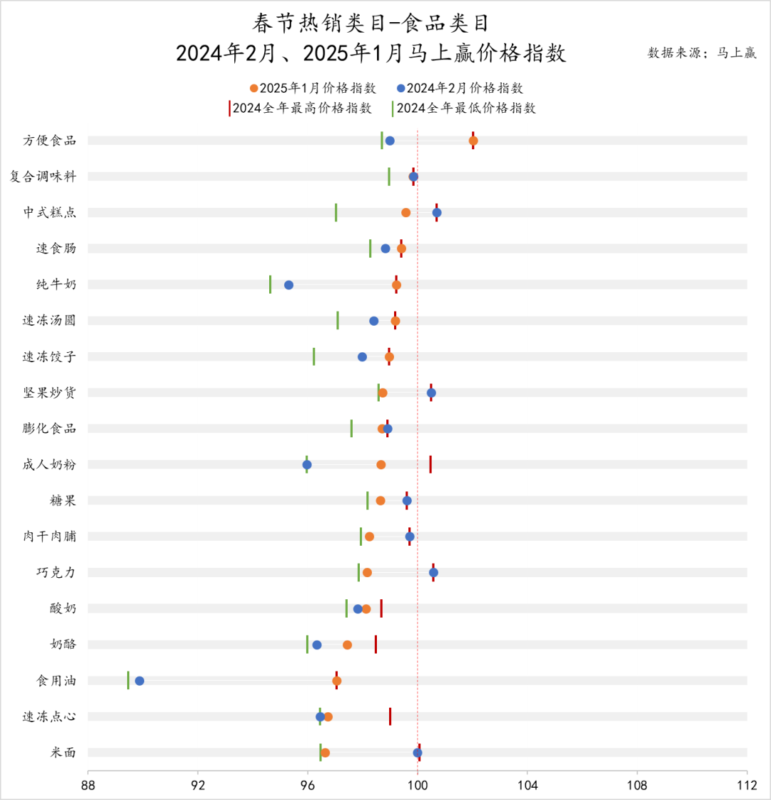 ·在2025年1月,價格指數(shù)超過100的類目,食品類中僅有方便食品一個。意味著即便是在春節(jié)錯位的情況下,依然僅有方便食品類目在今年春節(jié)月實現(xiàn)了價格上的正向增長。其余類目的價格指數(shù)均在96~100之間,依然有較大的類目價格推動增長壓力存在;