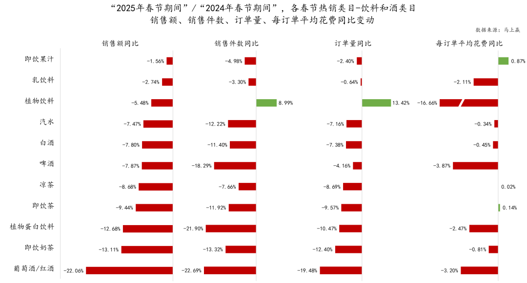 ·植物飲料作為2024年的黑馬類目無疑是亮點之一,但其在2025春節(jié)期間的表現(xiàn),體現(xiàn)了量升價降的發(fā)展狀態(tài)。一方面,其銷售件數(shù)/訂單量均有10%左右的同比增長,體現(xiàn)出消費者對這一類目的喜愛。但另一方面,銷售額同比-5%,以及每訂單平均花費-16%,又體現(xiàn)出了消費者對這一類目購物預算的縮減,以及正在走向“平價化、低價化”的類目走向。2025年,植物飲料一定是飲料類目中最引人關注的點之一,但同時隨著競爭加劇,后續(xù)發(fā)展還需要進一步觀察;