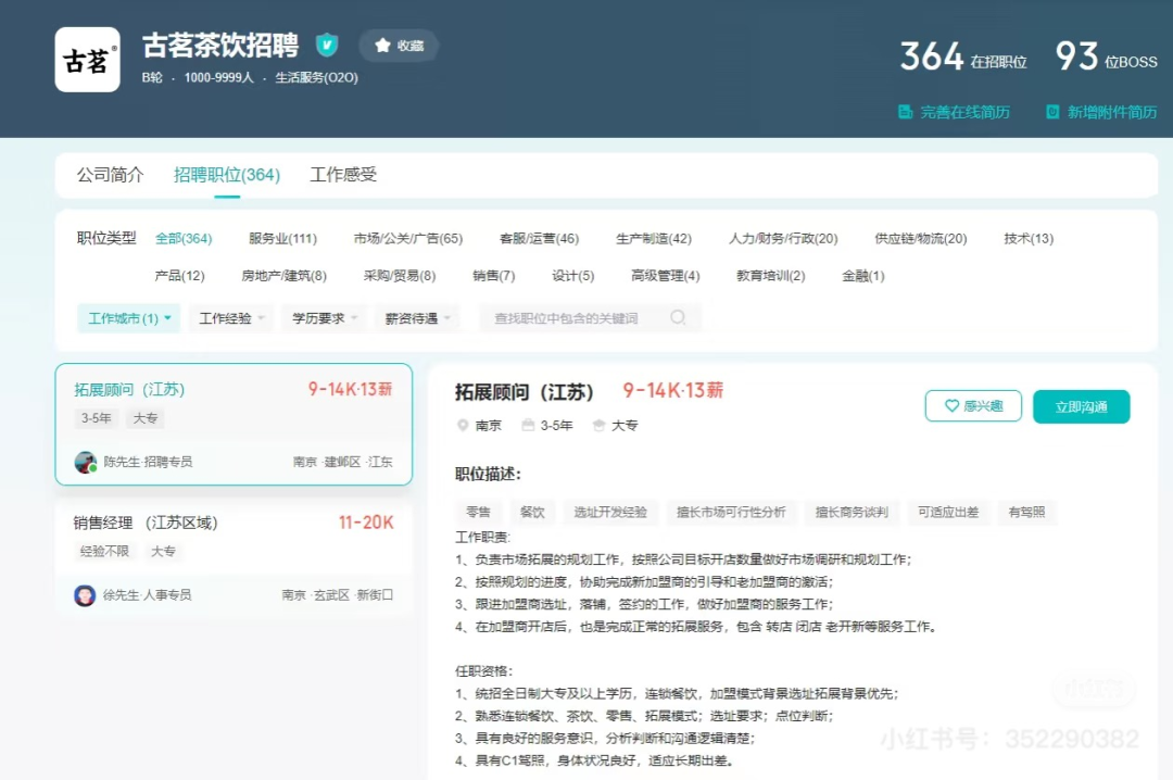 目前,古茗已經開始在上海、南京兩地招募相關團隊。BOSS直聘顯示,古茗于近日定位上海、南京兩地分別上架了新的崗位。定位上海發(fā)布的崗位為內控內審負責人,主要在杭州辦公。定位南京發(fā)布的崗位為銷售經理、拓展顧問,主要在江蘇區(qū)域辦公。