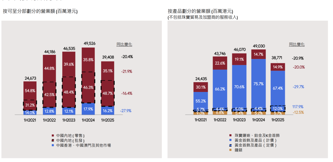 根據(jù)周大福2025財政年度上半年(截至2024年9月30日六個月)財報數(shù)據(jù),當(dāng)期周大?偁I收、歸母凈利潤同比分別下滑20%和44%。財報中指出,內(nèi)地部分消費者對購買黃金首飾持觀望態(tài)度,導(dǎo)致中國內(nèi)地市場營業(yè)額同比下跌18.8%。同時中國香港、中國澳門及其他市場也因市民外游及內(nèi)地旅客消費模式和喜好轉(zhuǎn)變而受到影響,營業(yè)額同比下跌了27.9%。