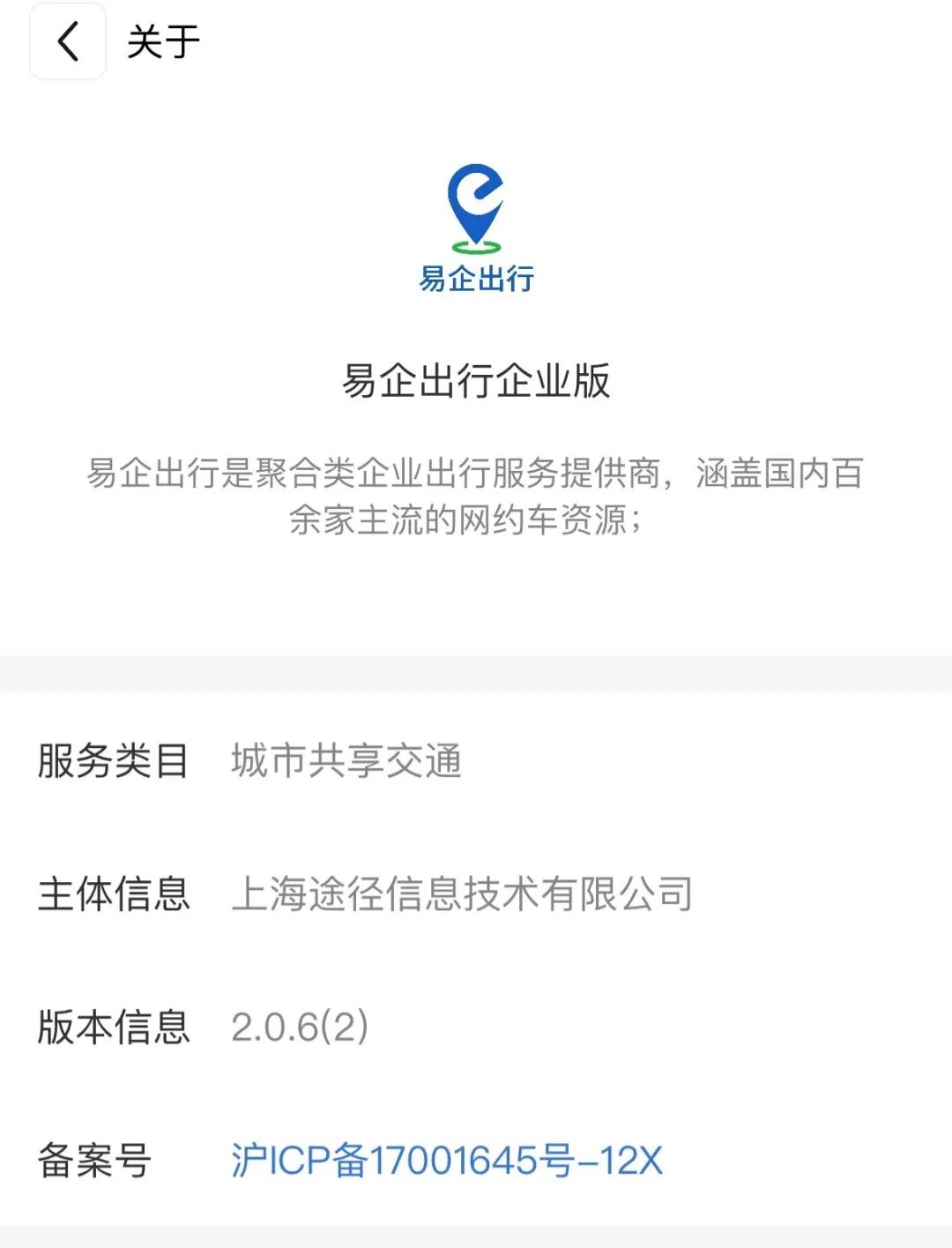 按照小程序詳情頁(yè)信息,易企出行是聚合類企業(yè)出行服務(wù)提供商,涵蓋國(guó)內(nèi)百余家主流的網(wǎng)約車資源,歸屬于城市共享交通服務(wù)類。