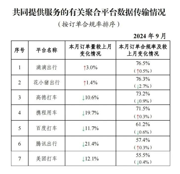 在這些訂單之中,由聚合平臺(tái)所完成的訂單數(shù)量達(dá)到了2.46億單,環(huán)比下降12.6%。按訂單合規(guī)率來(lái)排序,由高到低分別是滴滴出行、花小豬出行、高德打車、攜程用車、百度打車、騰訊出行以及美團(tuán)打車。