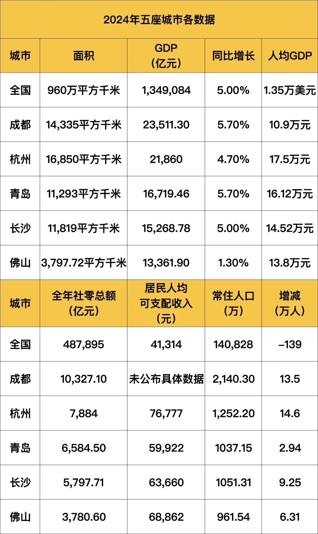 總體而言,盡管佛山2024年1.33萬(wàn)億元的GDP足以穩(wěn)居全國(guó)前20,居民人均可支配收入也排名靠前,但和成都、杭州、長(zhǎng)沙等老牌省會(huì)城市相比還是有明顯差距。
