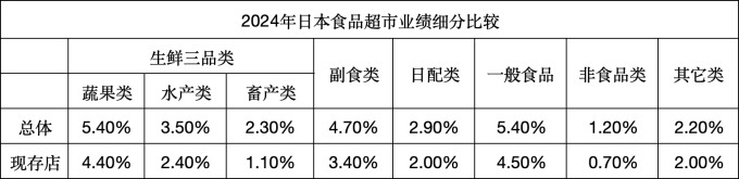 其中,最大項目為食品,銷售額為9.12萬億日元(約4379億人民幣),整體下降3.8%,現(xiàn)存(存量)店鋪增長4.4%。總體比較4個季度業(yè)績分布,一季度增長6.8%(現(xiàn)存店增長7.2%),二季度下降7.4%(現(xiàn)存店增長2.9%,三季度下降7.3%(現(xiàn)存店增長3.1%),四季度下降6.6%(現(xiàn)存店增長4.0%)。