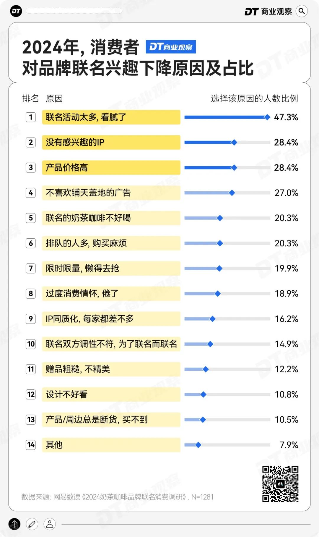 根據(jù)網(wǎng)易數(shù)讀發(fā)起的《2024奶茶咖啡品牌聯(lián)名消費(fèi)調(diào)研》顯示,人們對(duì)品牌聯(lián)名興趣下降的主要原因是“聯(lián)名活動(dòng)太多,看膩了”和“沒(méi)有感興趣的IP”,兩者的比例分別占據(jù)了47.3%和28.4%。