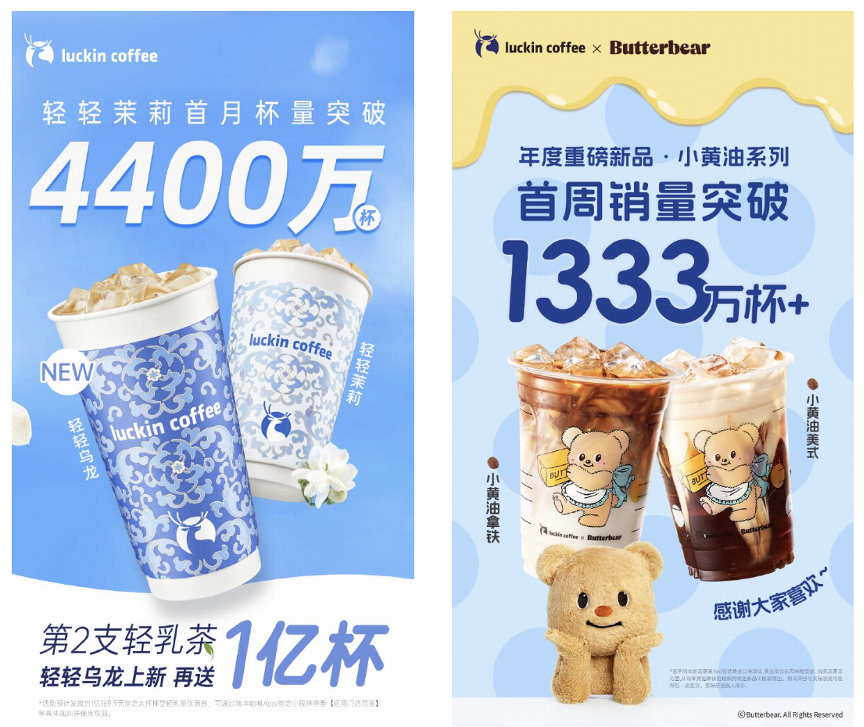 小黃油系列產(chǎn)品選擇了與產(chǎn)品名接近的表情包黃油小熊合作,借IP的社交話題和自發(fā)傳播,首周銷量突破1333萬(wàn)杯。