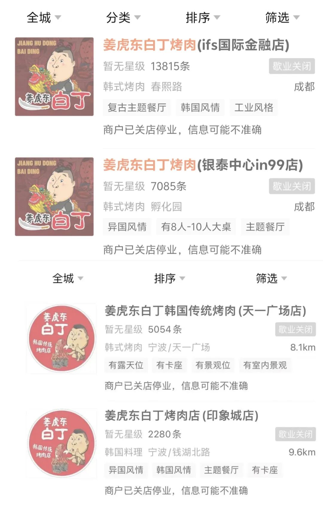 近期,寧波、成都、汕頭、南昌等地的姜虎東白丁烤肉門店被曝關停。大眾點評顯示,這些門店大多處于“歇業(yè)關閉”或“暫停營業(yè)”的狀態(tài)。