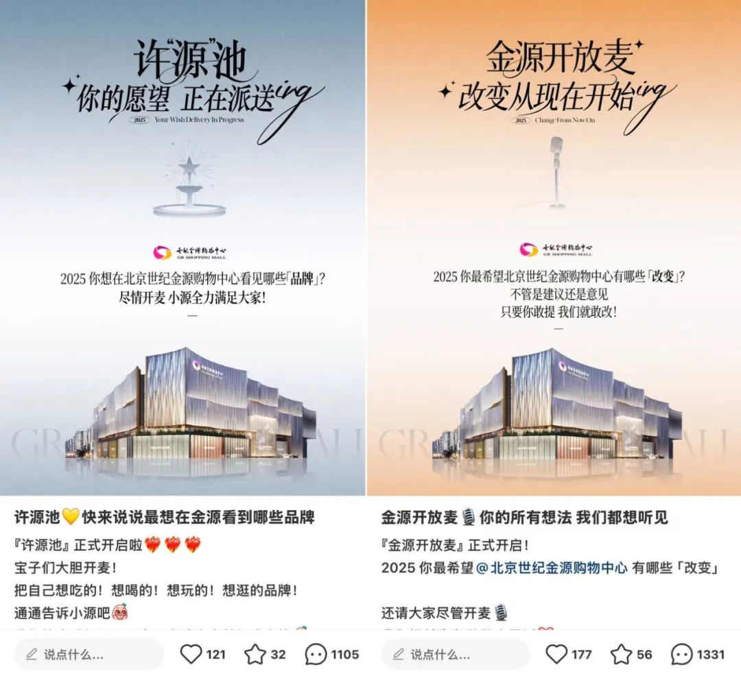 兩天后,項目在小紅書上向消費者征集意見,“2025年你最希望北京世紀金源購物中心有哪些改變”,截至目前已經收到了1331條評論。更早之前的2月8日,項目還在小紅書上向消費者征集想要看見的品牌,并且置頂了這條消息,目前也收到了1105條評論,從這些動作中也能看到北京世紀金源購物中心的努力。