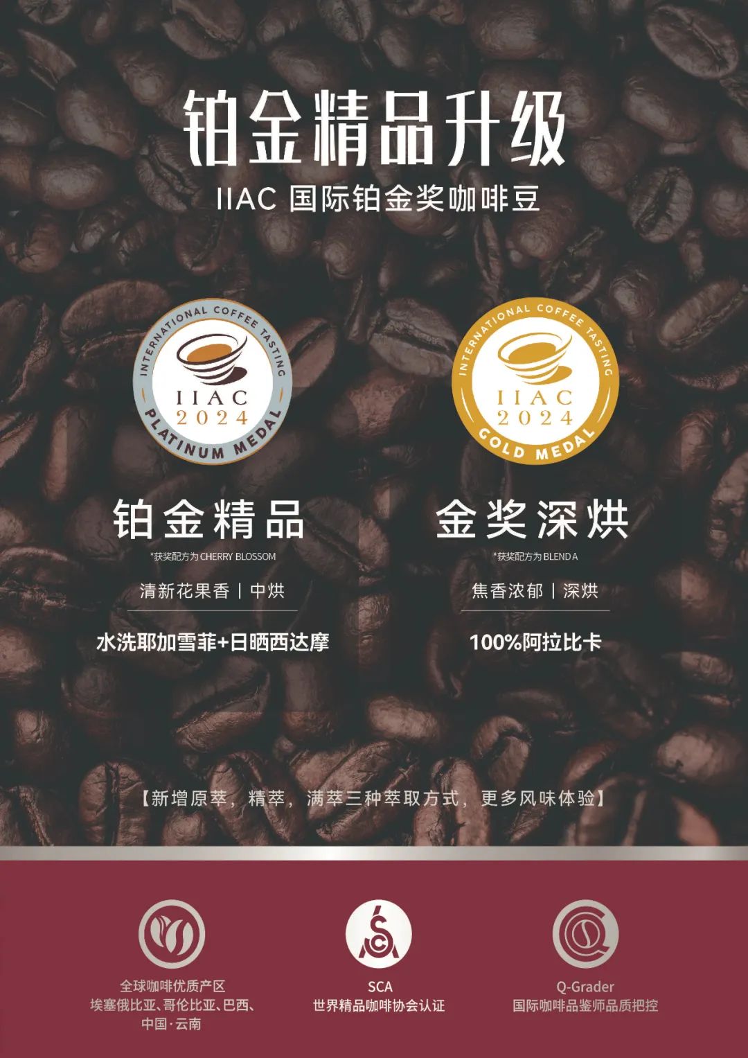 當(dāng)然,平價不意味著要降低成本犧牲產(chǎn)品質(zhì)量。相反,庫迪精選來自埃塞俄比亞、巴西、哥倫比亞以及中國云南等全球核心產(chǎn)區(qū)的100%阿拉比卡深烘咖啡豆,并在2024年的IIAC國際咖啡品鑒大賽中榮獲七項金獎,成為摘金最多的中國連鎖咖啡品牌。