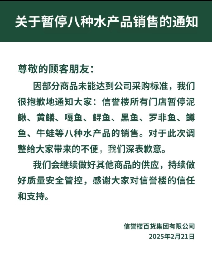 聯(lián)商快訊:2月21日,信譽樓發(fā)布了關(guān)于暫停八種水產(chǎn)品銷售的通知。