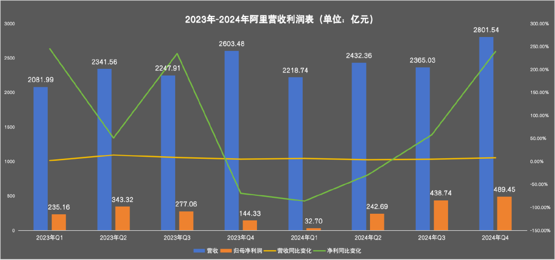 財報顯示,2024年Q4阿里表現(xiàn)穩(wěn)健,營收同比增長8%至2801.54億元,歸母凈利潤同比上升239.12%至489.45億元。而2024年全年,阿里營收9817.67億元,歸母凈利潤2203億元。
