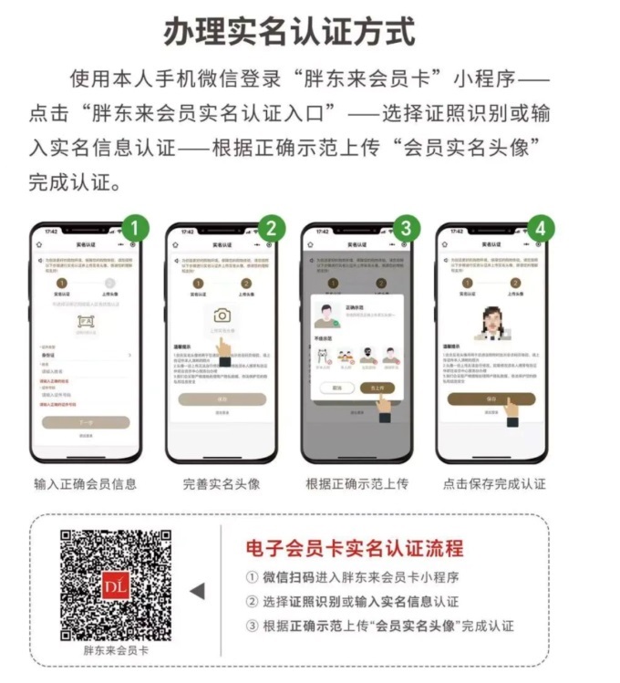 辦理實(shí)名認(rèn)證方式:使用本人手機(jī)微信登錄“胖東來(lái)會(huì)員卡”小程序——點(diǎn)擊“胖東來(lái)會(huì)員實(shí)名認(rèn)證入口”——選擇證照識(shí)別或輸入實(shí)名信息認(rèn)證——根據(jù)正確示范上傳“會(huì)員實(shí)名頭像完成認(rèn)證。