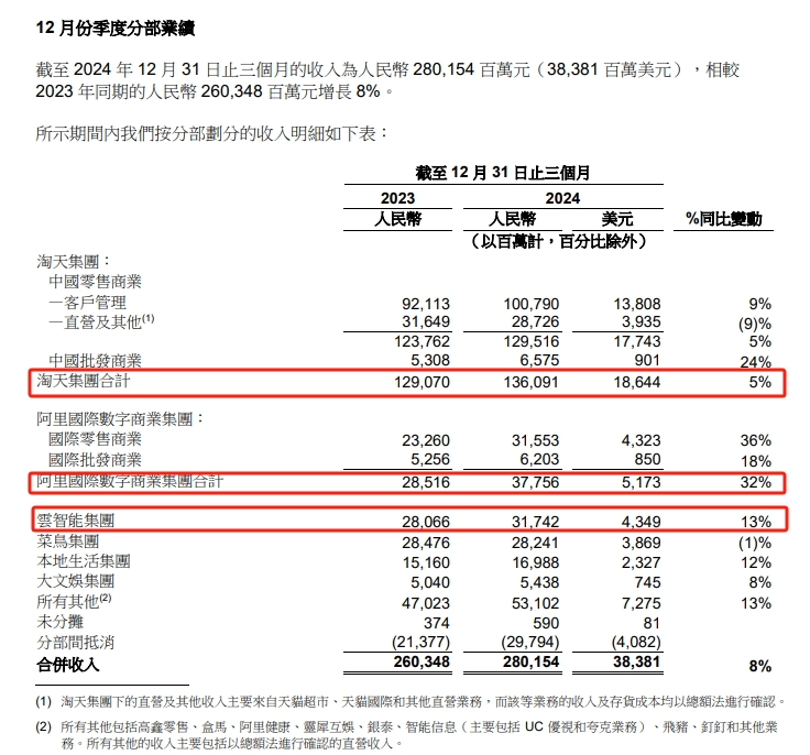 具體而言,阿里巴巴發(fā)布的2025財年第三季度(截至2024年12月)業(yè)績報告顯示,公司總營收達到2801.5億元,同比增長8%,超出市場預(yù)估的2773.7億元;經(jīng)營利潤為412.05億元,同比增長高達83%;