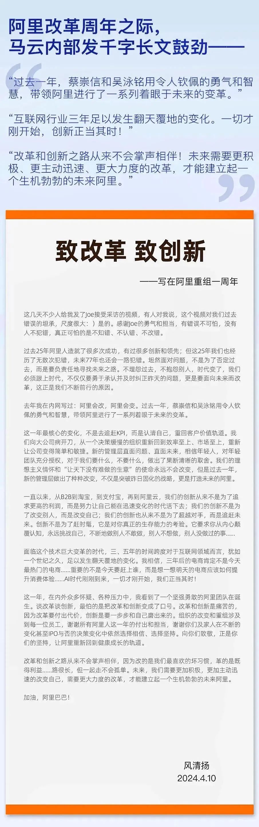 馬云在文末還著重強調(diào),阿里未來需要更加積極的改變和更大力度的改革。