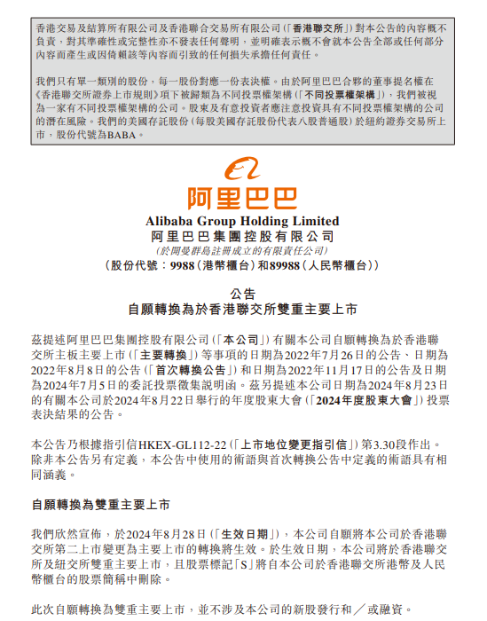 2024年8月,阿里巴巴集團正式完成香港雙重主要上市,成為在港交所和紐交所雙重主要上市的公司。