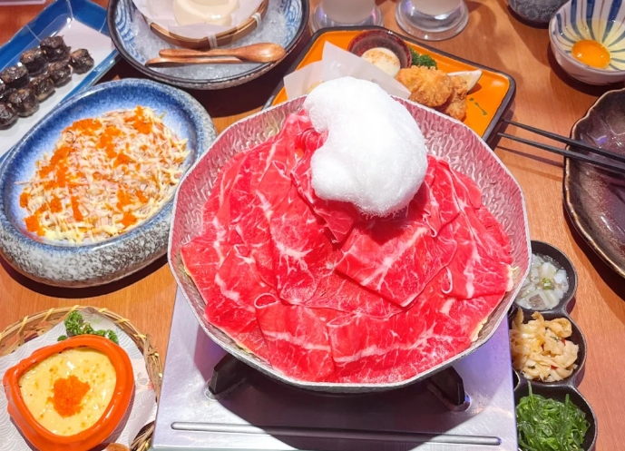 所謂“富士山壽喜燒”,即將牛肉堆砌成小山形狀,頂部放上蓬松柔軟的棉花糖,就像富士山頂?shù)姆e雪,光靠顏值就圈粉不少。
